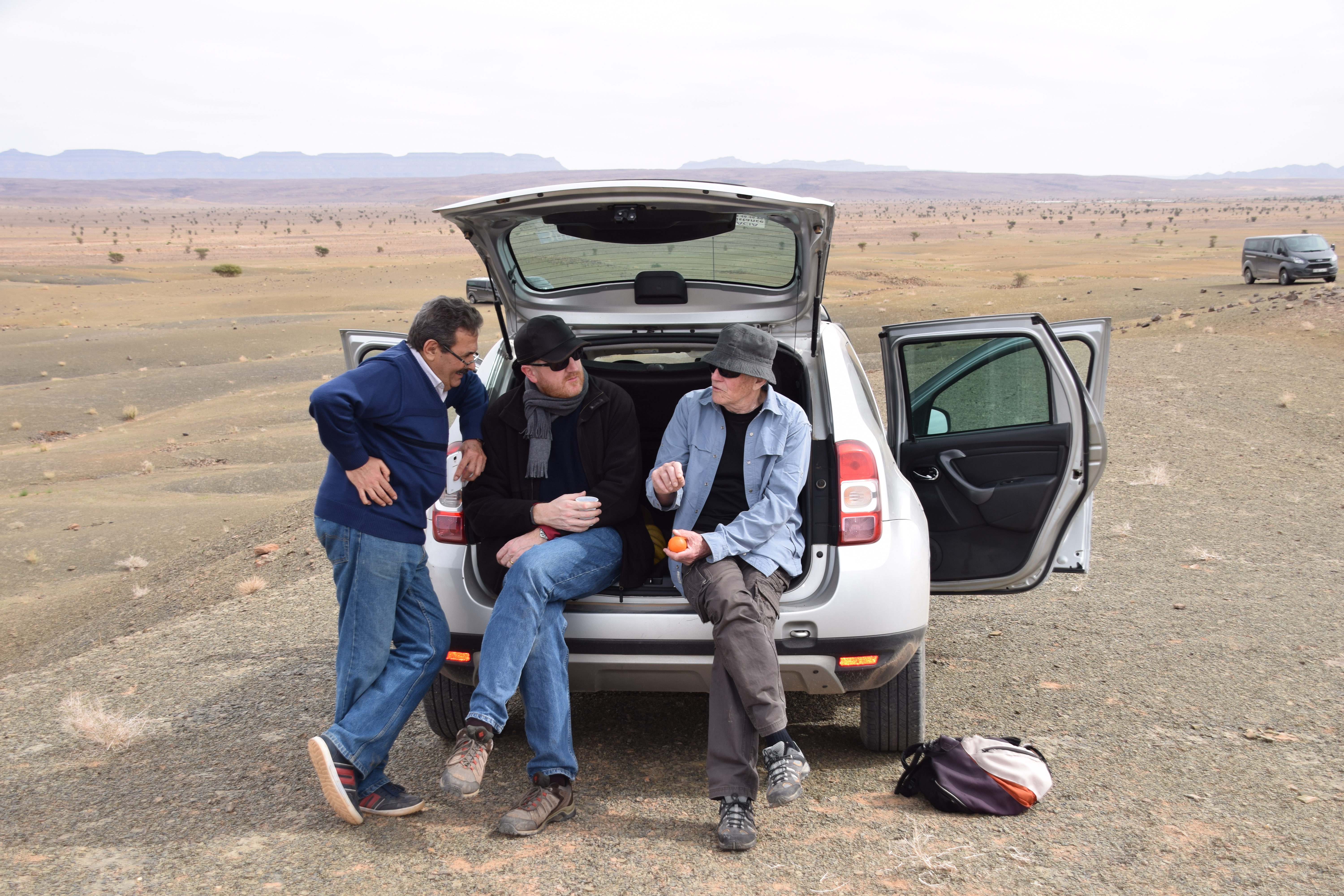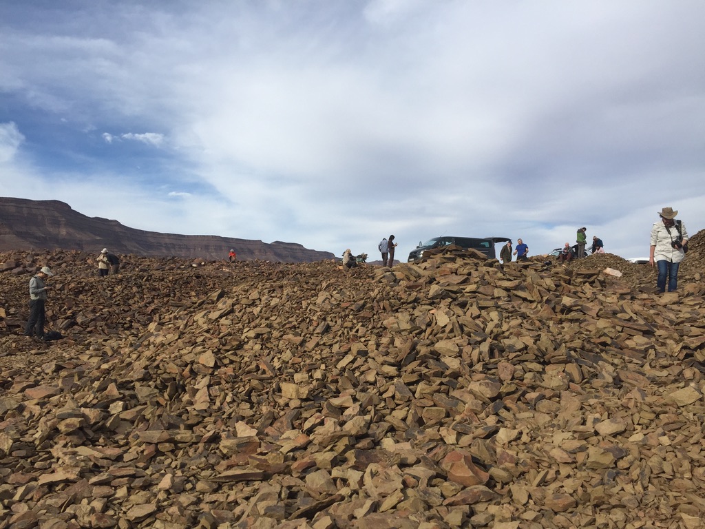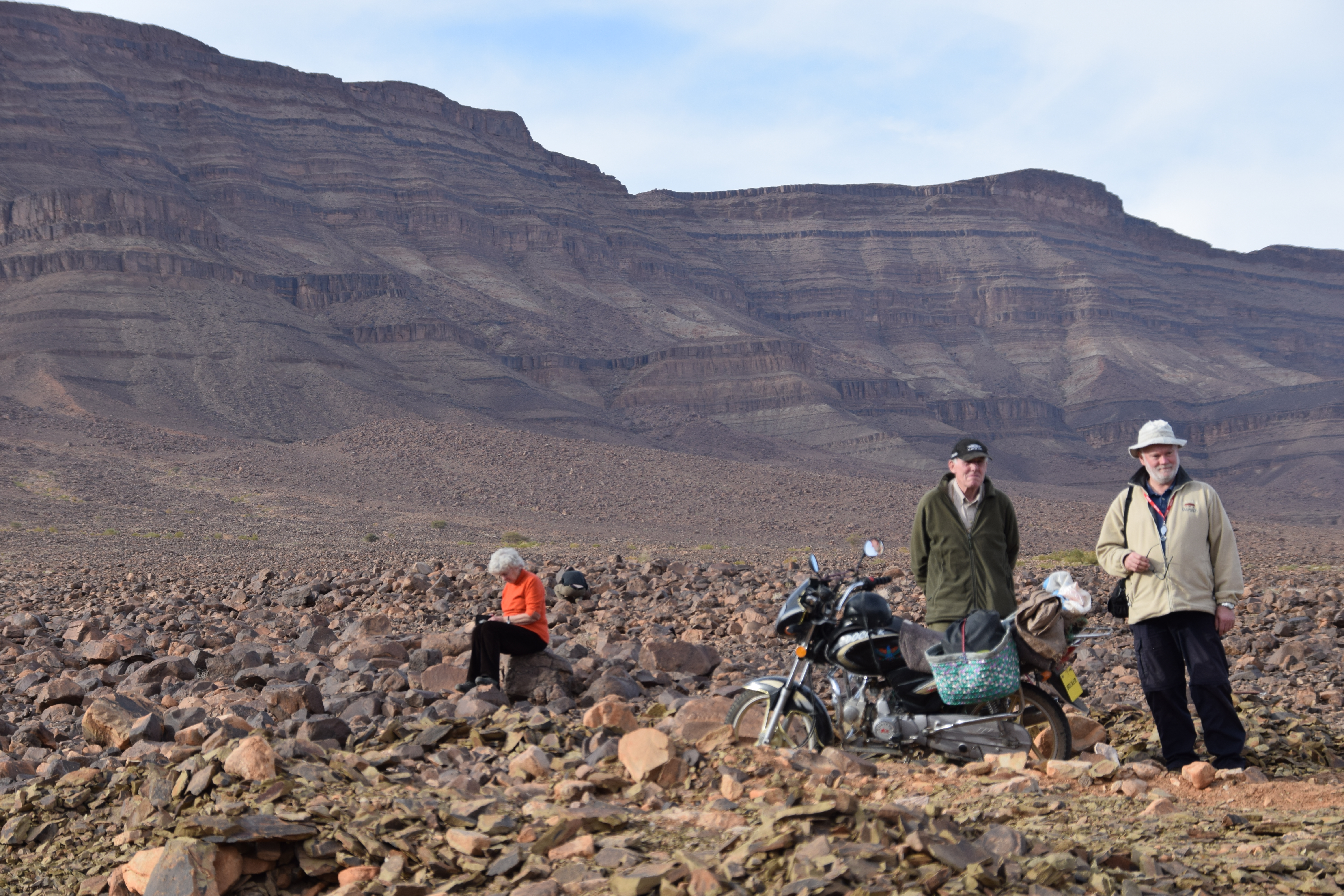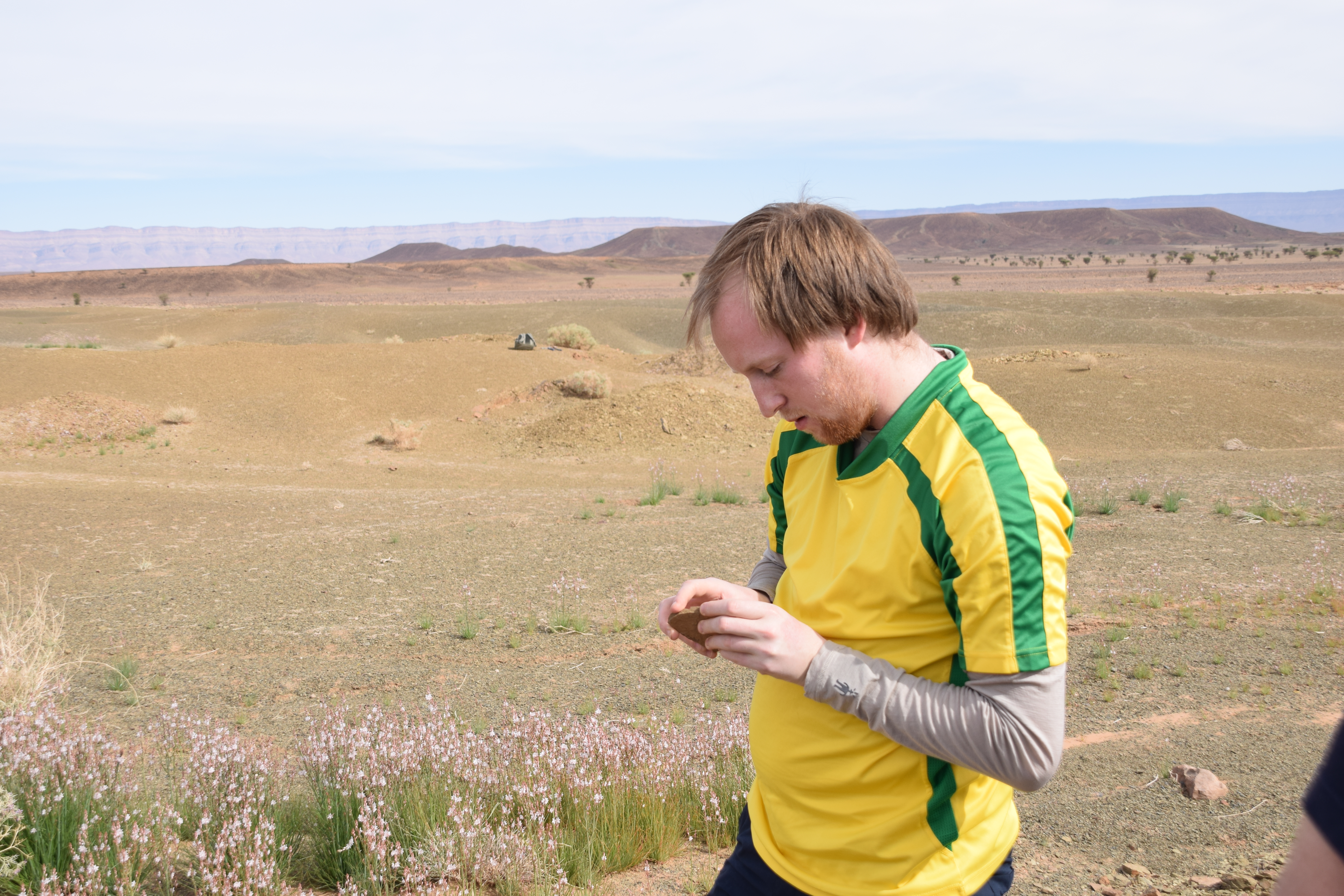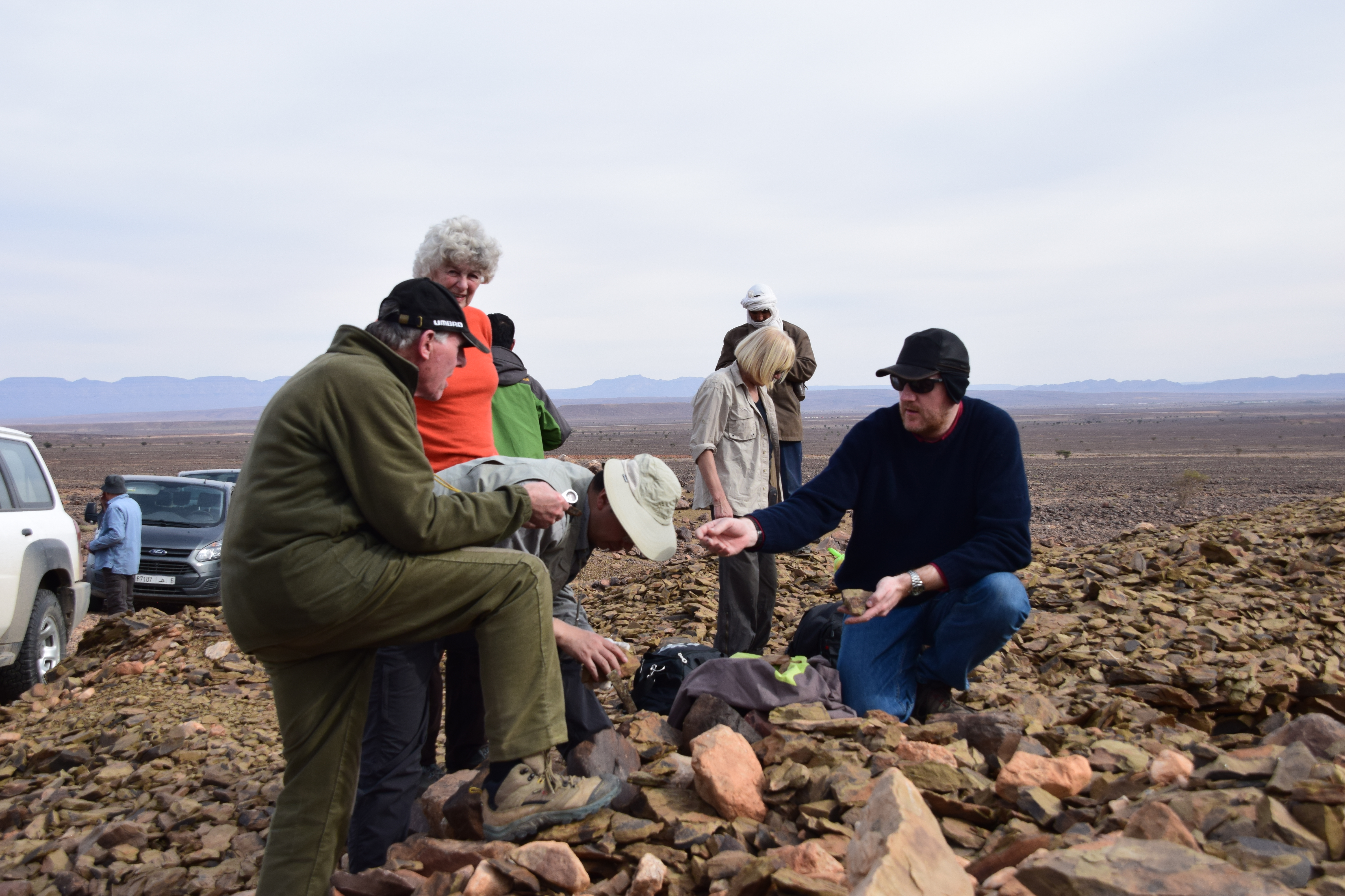 A highlight of the trip was examining the Fezouata Formation at You Izargane, where participants were able to examine the late Tremadocian (A. murrayi zone) portion of the Fezouata replete with trilobites, incredibly well preserved graptolites, and the lagerstatte bearing layers. In the afternoon, we visited Jbel Bou Zeroual (with directional assistance from a local camel shepherd on a motorbike), the Floian section of the Fezouata Formation. Here we collected many trilobites, echinoderms, and other typical Ordovician shelly fauna.