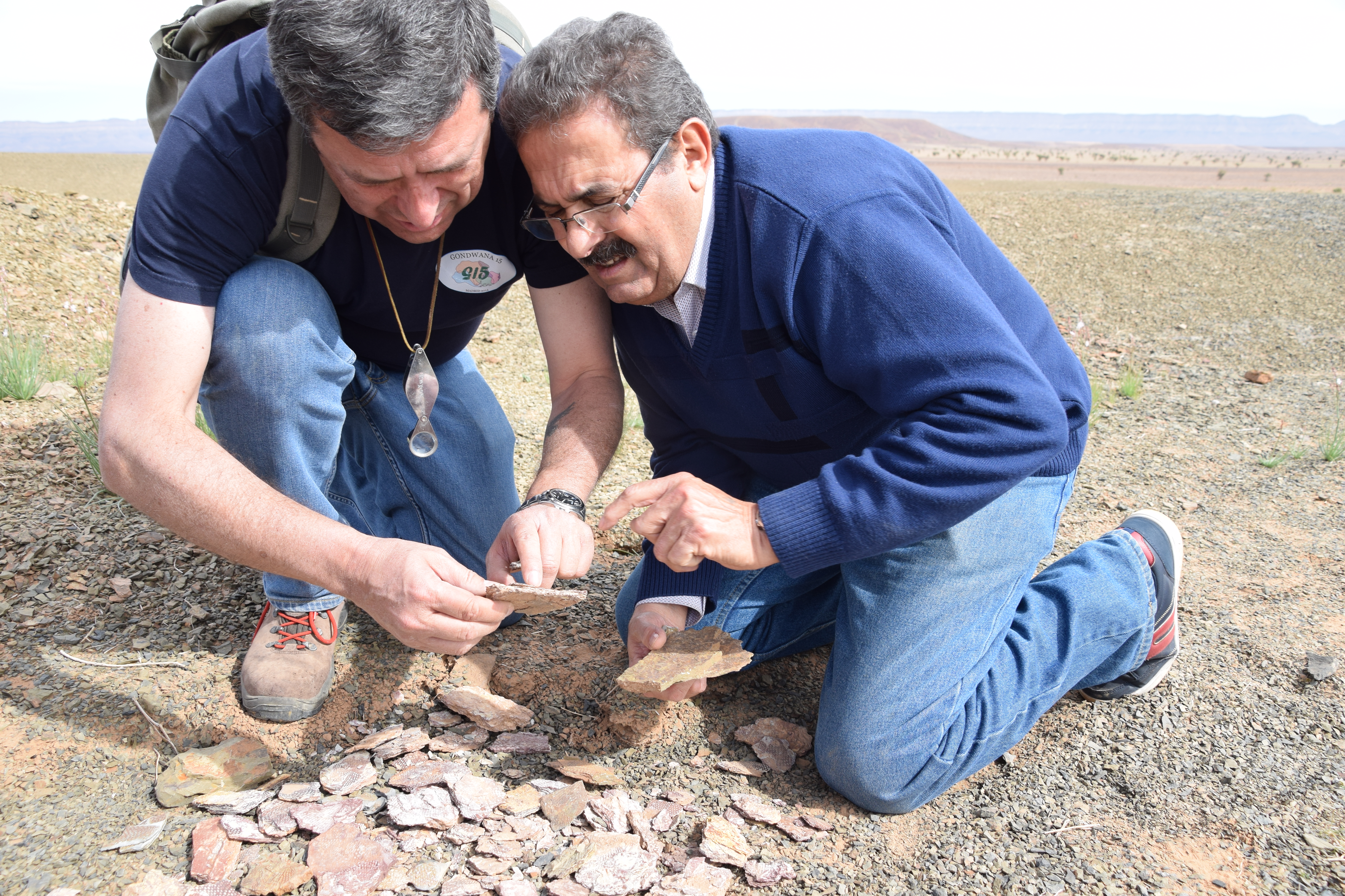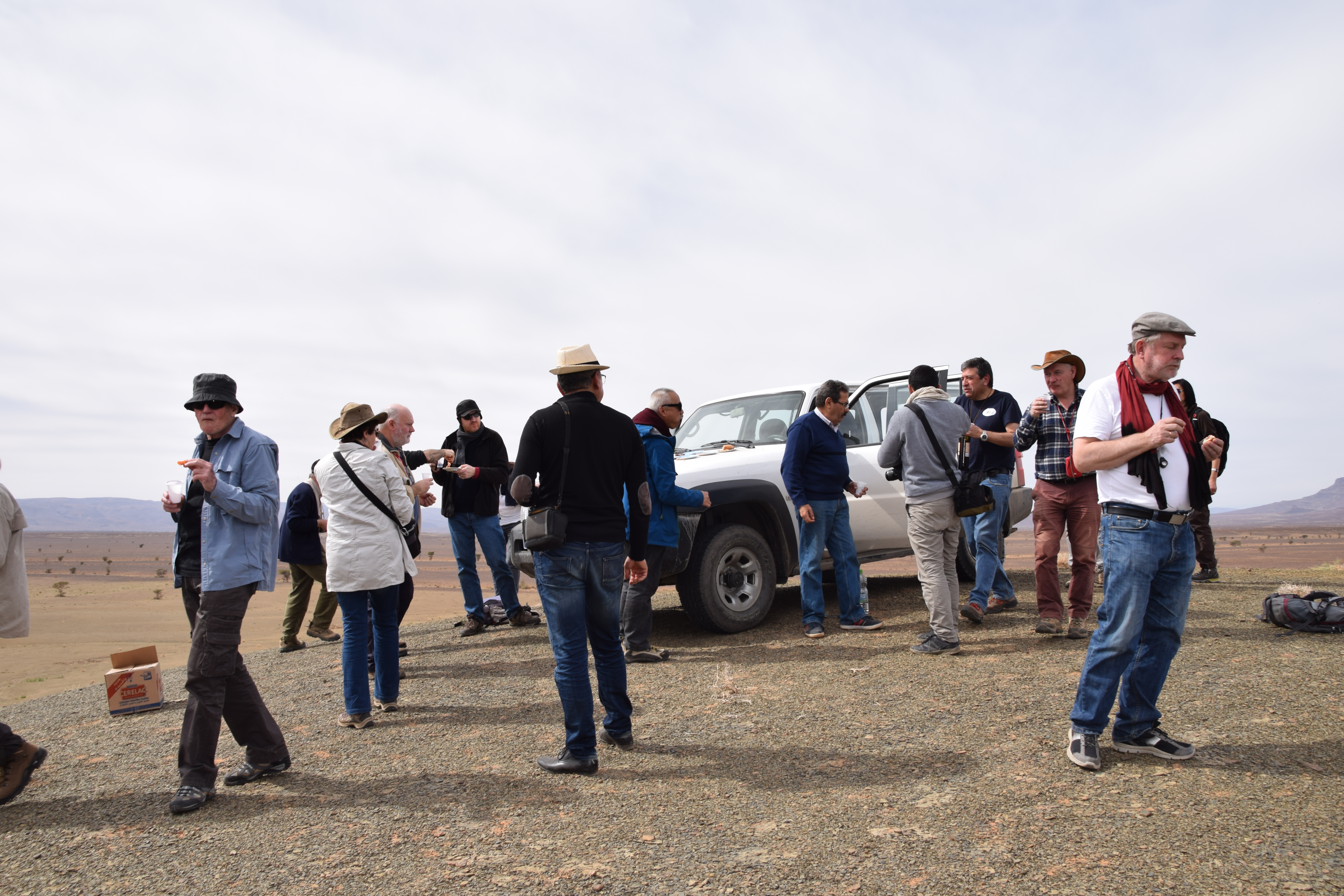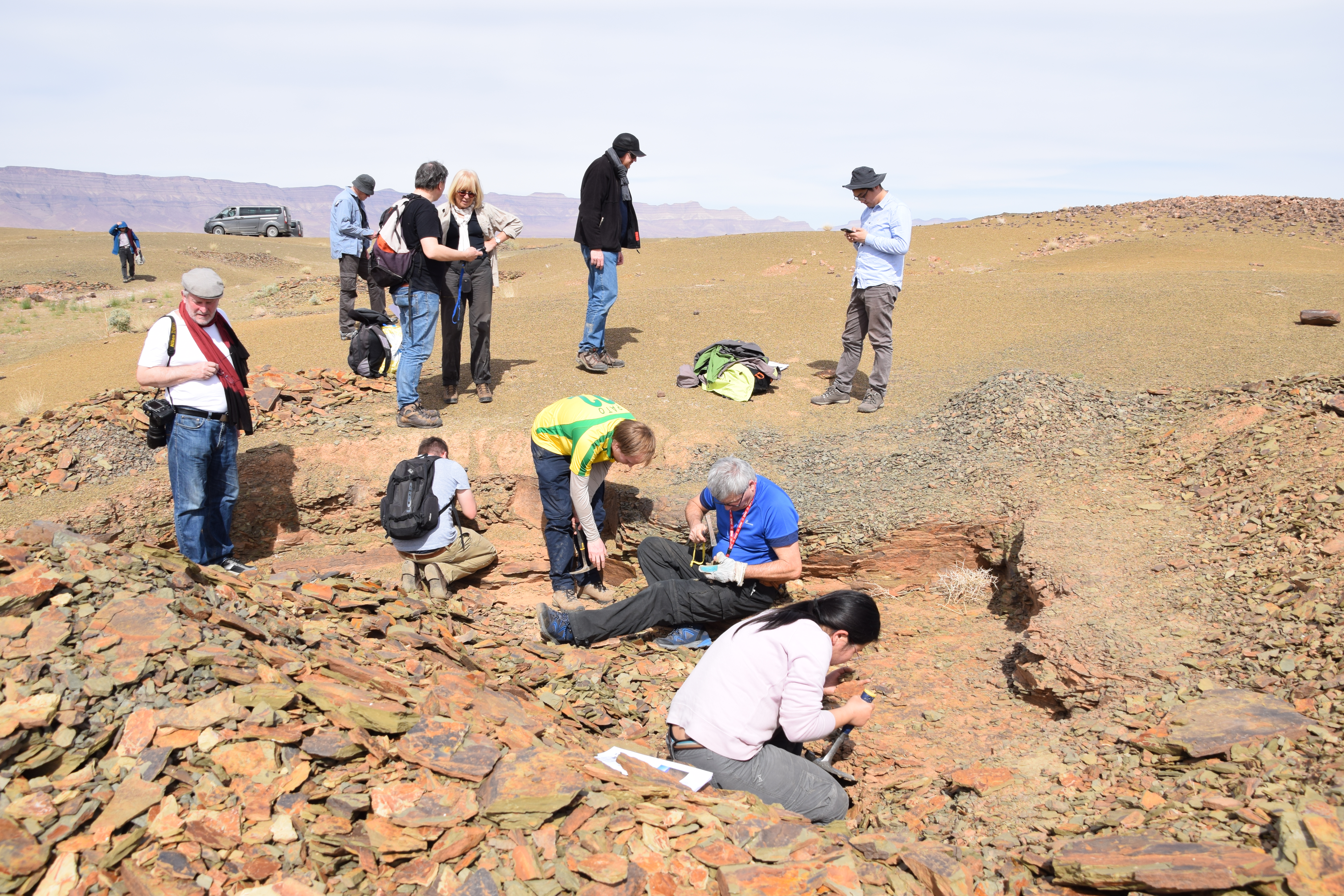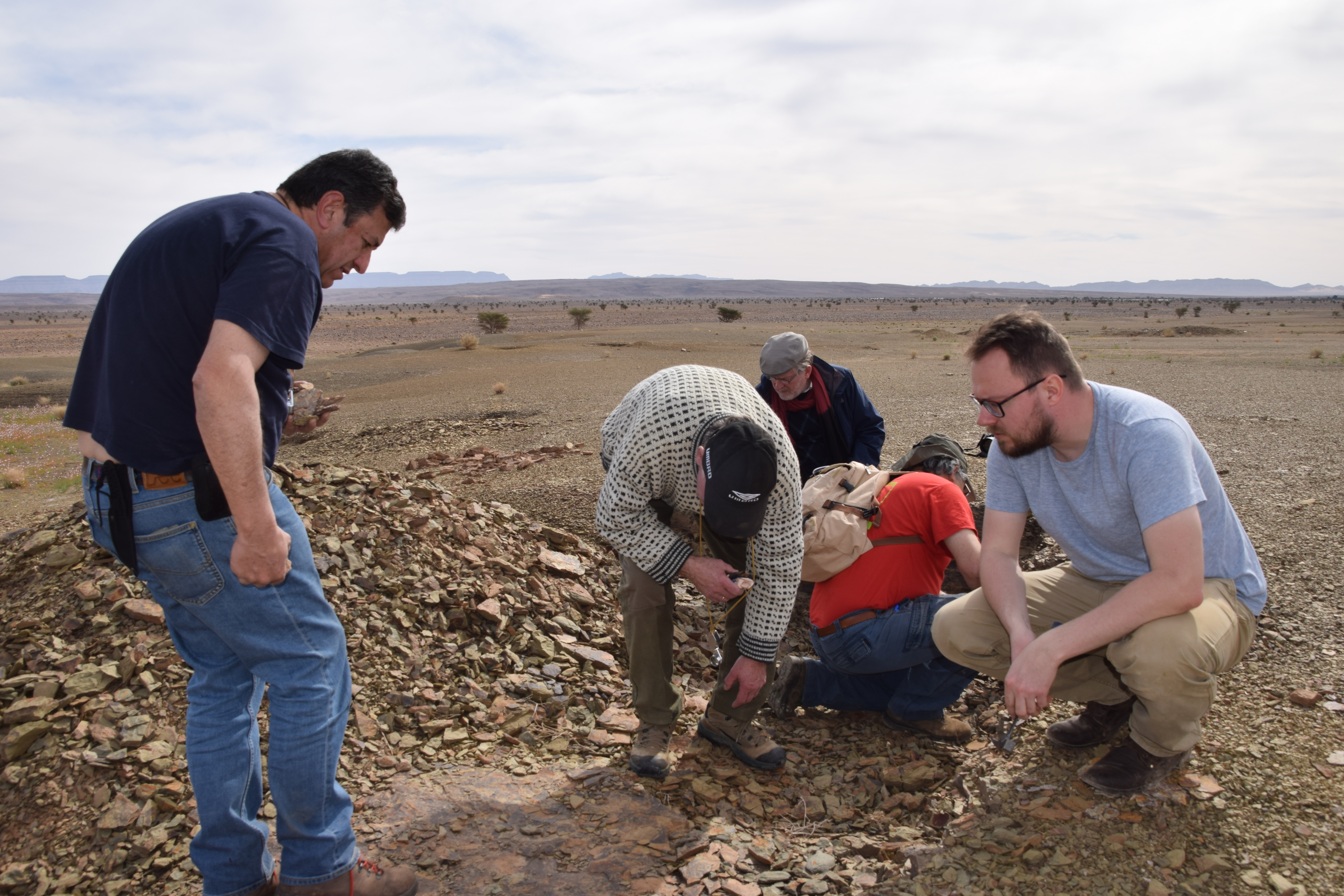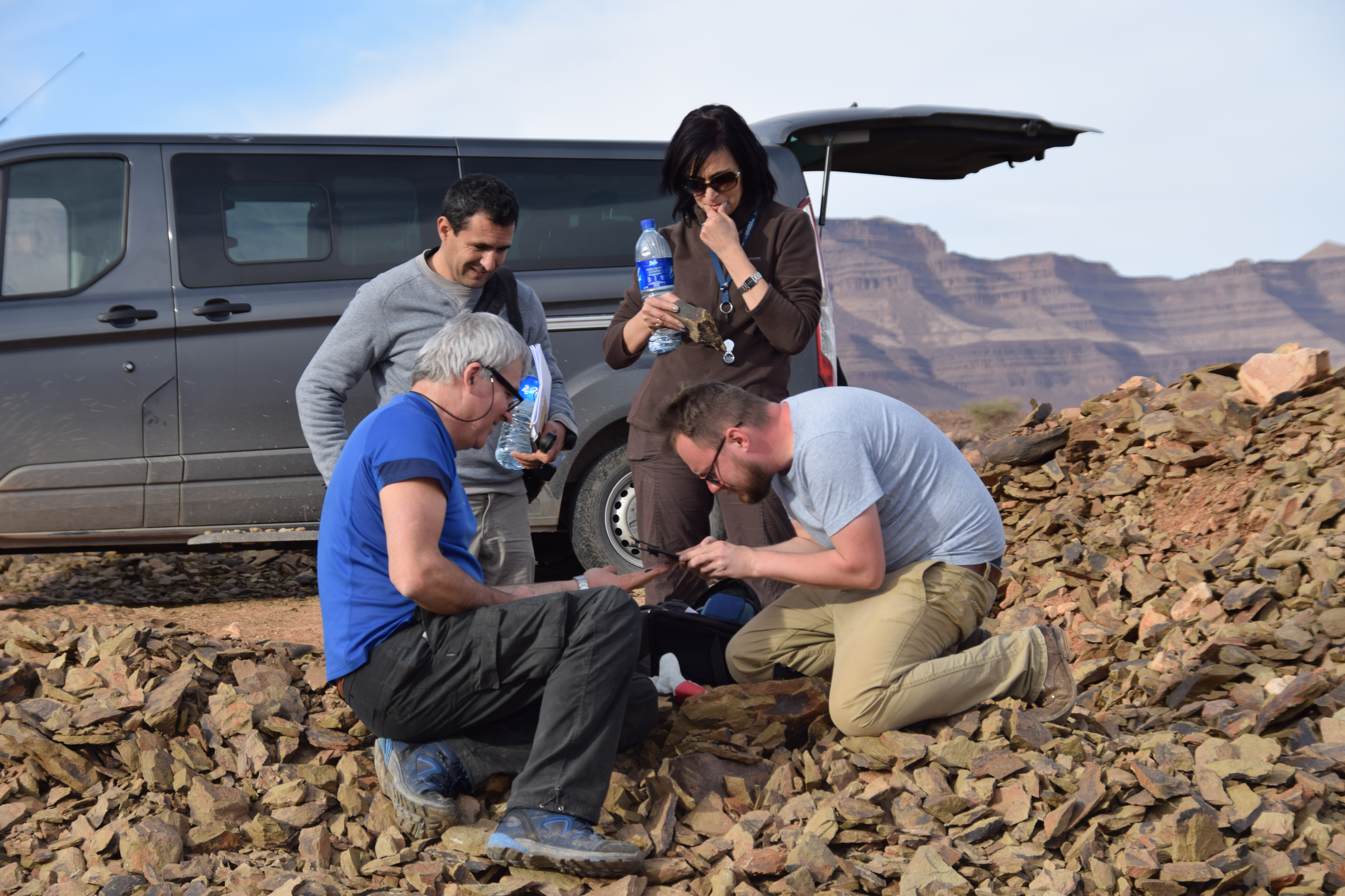 A group of 28 international scientists followed the workshop with a field excursion to the Fezouata Formation that was expertly organized by Bertrand Lefebvre. We crossed the High Atlas Moutains via the Tizi n’Tichka Pass then descended to the Ternata Plain. En route to Zagora, we stopped for an overview of the stratigraphy and structural geology of the Jbel Kissing and the Draa Valley.